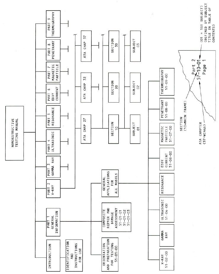 無損檢測(cè)手冊(cè)是機(jī)體、發(fā)動(dòng)機(jī)和部件制造廠編制的無損檢測(cè)程序,不僅包含主要的和輔助的結(jié)構(gòu),而且包括專利的部件的檢測(cè)程序,是機(jī)體、發(fā)動(dòng)機(jī)和部件制造廠在真實(shí)的構(gòu)件上和原位實(shí)際狀態(tài)下經(jīng)過驗(yàn)證可以實(shí)施的程序,每種機(jī)型均有相應(yīng)的無損檢測(cè)手冊(cè),制造廠家定期進(jìn)行更新和修正,在兩次定期進(jìn)行更新和修正之間通常發(fā)布一些臨時(shí)修正,在使用時(shí)要注意采用有效版本。