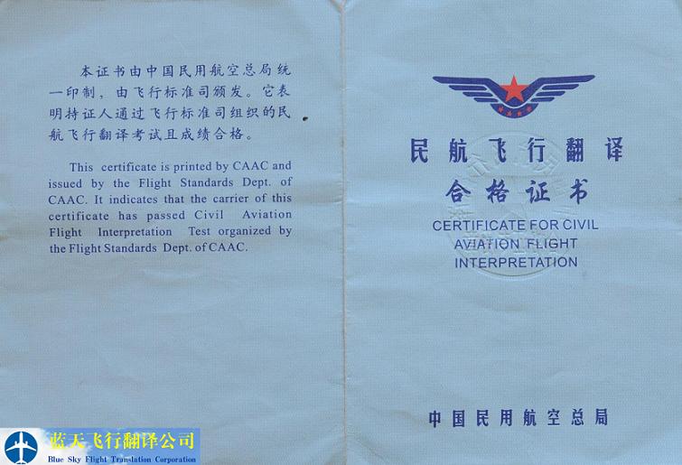 民航飛行翻譯合格證書(Certificate for civil aviation flight interpretation)(簡稱飛翻證)由中國民用航空總局統(tǒng)一印制,由飛行標(biāo)準(zhǔn)司頒發(fā)。它表明持證人通過飛行標(biāo)準(zhǔn)司組織的民航飛行翻譯考試且成績合格。 This certificate is printed by CAAC and issued by the Flight Standards Dept. of CAAC. It indicates that the carrier of this certificate has passed Civil Aviation Flight Interpretation Test organized by the Flight Standards Dept. of CAAC. 民航飛行翻譯合格證書 Certificate for civil aviation flight interpretation 中國民用航空總局 民航飛行翻譯合格證書1 Certificate for civil aviation flight interpretation 2 |