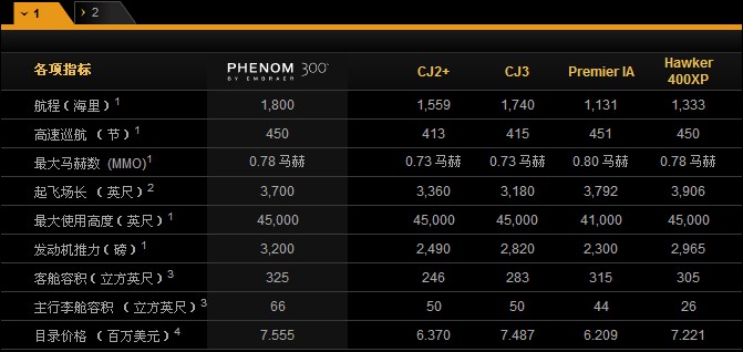 飛鴻300公務(wù)機(jī)最佳價值 1 - 按照2008年5月出版的公務(wù)/商用飛機(jī)采購手冊的說明,所有飛機(jī)的航程均是在攜帶了符合NBAA IFR 規(guī)定的飛往100海里備降場的備份燃油量,并且搭載4位乘客每位重200磅的基礎(chǔ)上給出的。最大使用馬赫數(shù)、高速巡航、行李艙容積、后行李艙以及最大使用高度等數(shù)據(jù)均來自相同的資料。 2 - 國際標(biāo)準(zhǔn)大氣、最大起飛重量、海平面。 3 - 基于2007/2008年度Conklin & de Decker飛機(jī)對比報告和競爭者的公開數(shù)據(jù)。 4 - 所有競爭對手產(chǎn)品的價格均在2007/2008年度公務(wù)/商用飛機(jī)采購手冊數(shù)據(jù)的基礎(chǔ)上給出。飛鴻300飛機(jī)2008年1月的價格等同于2005年1月685萬美元的價格。