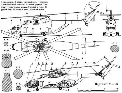 ![]() 米26直升機(jī)三視圖 米26直升機(jī)介紹 旋翼直徑:32.00m 尾槳直徑:7.61m 機(jī)長(旋翼和尾槳轉(zhuǎn)動):40.03m 機(jī)身長(尾槳除外):35.91m 機(jī)高(到旋翼槳轂頂部):8.15m 機(jī)高(尾槳旋轉(zhuǎn)):11.60m 水平尾翼翼展:6.02m 主輪距:7.17m 前主輪距:8.95m 米-26內(nèi)部尺寸 貨艙 長度(裝卸跳板放下)15.00m (不包括跳板) 12.00m |