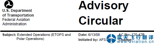 北京藍(lán)天飛行翻譯公司完成國(guó)有大型航空公司的延程運(yùn)行(ETOPS和極地運(yùn)行)咨詢通告翻譯任務(wù) Extended Operations (ETOPS and Polar Operations) Advisory Circular Translation ![]() 延程運(yùn)行(ETOPS和極地運(yùn)行)咨詢通告 Extended Operations (ETOPS and Polar Operations) Advisory Circular 延程運(yùn)行(ETOPS和極地運(yùn)行)咨詢通告(Extended Operations (ETOPS and Polar Operations) Advisory Circular)的主要內(nèi)容包含有: GENERAL |