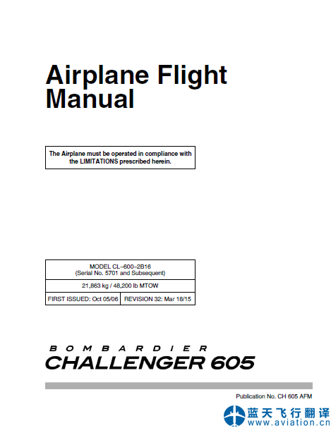 北京藍(lán)天飛行翻譯公司完成大型公務(wù)機(jī)公司的第32版/2015年3月18日版本龐巴迪挑戰(zhàn)者605全套飛行手冊(cè)翻譯任務(wù):第32版龐巴迪挑戰(zhàn)者605飛機(jī)飛行手冊(cè)、機(jī)組操作手冊(cè)、快速檢查單 Revision 32 Mar 18/15 Bombardier Challenger 605 Airplane Flight Manual, Flight Crew Operating Manual, Quick Reference Handbook Translation ![]() 龐巴迪挑戰(zhàn)者605飛機(jī)飛行手冊(cè) Bombardier Challenger 605 Airplane Flight Manual ![]() 龐巴迪挑戰(zhàn)者605機(jī)組操作手冊(cè)第一冊(cè) Bombardier Challenger 605 Flight Crew Operating Manual ![]() 龐巴迪挑戰(zhàn)者605機(jī)組操作手冊(cè) Bombardier Challenger 605 Flight Crew Operating Manual ![]() 龐巴迪挑戰(zhàn)者605快速檢查單第一冊(cè) Bombardier Challenger 605 Quick Reference Handbook ![]() 龐巴迪挑戰(zhàn)者605快速檢查單第二冊(cè) Bombardier Challenger 605 Quick Reference Handbook |