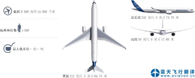 空中客車 A350-800 尺寸 總長(zhǎng)度 60.54 米 客艙長(zhǎng)度 -- 機(jī)身寬度 5.96 米 最大客艙寬度 5.61 米 翼展(幾何體) 64.75 米 高度 17.05 米 輪距 10.60 米 輪軸距 24.86 米 容量
