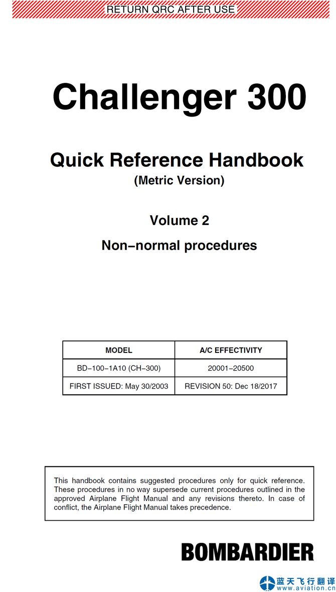 北京藍(lán)天飛行翻譯公司完成大型公務(wù)機(jī)公司2017年12月18日版本龐巴迪挑戰(zhàn)者300公務(wù)機(jī)快速檢查單翻譯任務(wù) Rev 50, Dec 18/2017 Bombardier Challenger 300 Quick Reference Handbook Translation ![]() 龐巴迪挑戰(zhàn)者300公務(wù)機(jī)快速檢查單 Bombardier Challenger 300 Quick Reference Handbook QRH 龐巴迪挑戰(zhàn)者300公務(wù)機(jī)快速檢查單(Quick Reference Handbook QRH)的主要內(nèi)容包含有: 01 - APU - Contents |