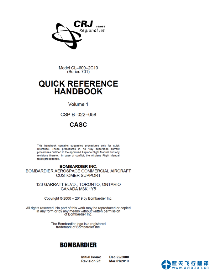 本次翻譯的CRJ700快速檢查單為第25版,2019年3月1日版本,分為上下兩冊。Model CL−600−2C10
