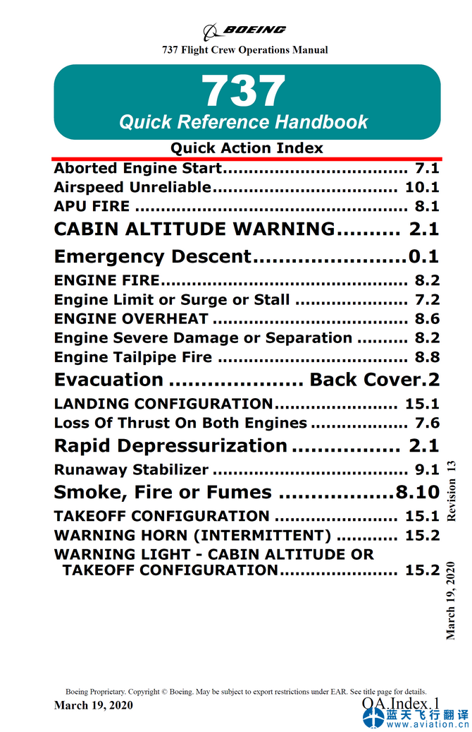 北京藍(lán)天飛行翻譯公司本次翻譯的波音737NG快速檢查單(Quick Reference Handbook)版本日期為2020年3月19日最新版,包含20架波音737飛機(jī)。