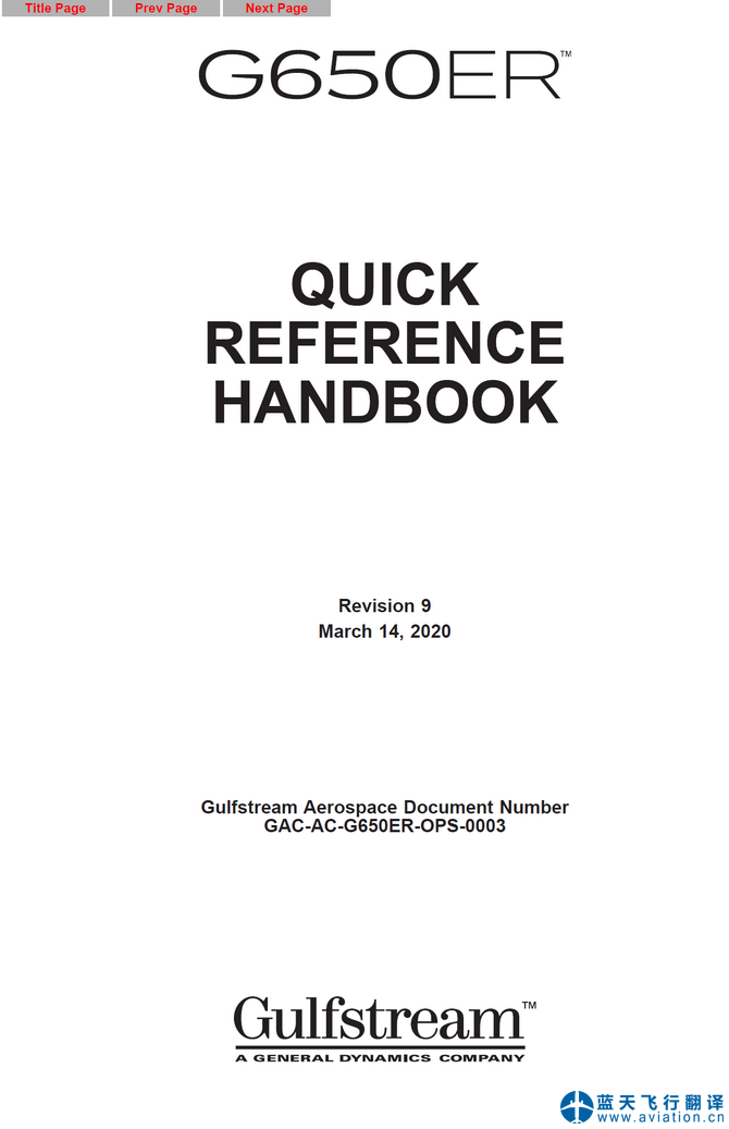 北京藍天飛行翻譯有限公司完成大型公務(wù)機公司的2020年3月14日版本灣流G650ER快速檢查單翻譯任務(wù) Revision 9 March 14, 2020 G650ER QUICK REFERENCE HANDBOOK Translation