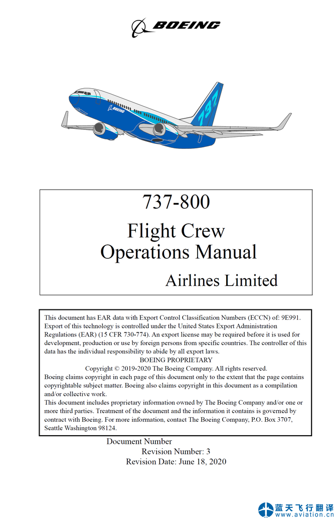 北京藍(lán)天飛行翻譯公司本次翻譯的波音737-800飛行機(jī)組使用手冊(Flight Crew Operations Manual)和快速檢查單(Quick Reference Handbook)版本日期為2020年6月18日,包含5架波音737-800飛機(jī)。