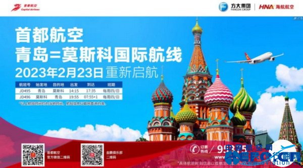 中國(guó)民用航空網(wǎng)訊(2023年2月11日 通訊員 李靜)隨著越來(lái)越多的旅客有國(guó)際商務(wù)往來(lái)、探親旅游的計(jì)劃,國(guó)際航班的需求也隨之不斷提升。為滿足廣大旅客出行需求,海航航空旗下首都航空計(jì)劃2023年2月23日恢復(fù)青島=莫斯科國(guó)際航線,為旅客由國(guó)內(nèi)出發(fā)至俄羅斯提供新的航線選擇。